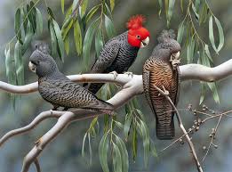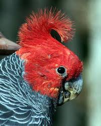 The gang-gang cockatoo (Callocephalon fimbriatum) is found in the cooler and wetter forests and woodlands of Australia, particularly alpine bushland. Mostly mild grey in colour with some lighter scalloping (more pronounced and buffy in females), the male has a red head and crest, while the female has a small fluffy grey crest. It ranges throughout south-eastern Australia. The gang-gang cockatoo is the faunal emblem of the Australian Capital Territory. It is easily identified by its distinctive call, which is described as resembling a creaky gate, or the sound of a cork being pulled from a wine bottle.