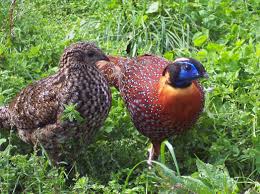 When it is mating season, male satyr tragopans grow blue horns and a gular wattle. When ready to display, they will inflate their horns and hide behind a rock, waiting for females to pass by. When one does, they will perform an elaborate and attractive display in front of the females. At the end of the display, the male will stretch to his full height and show off all of his ornaments.